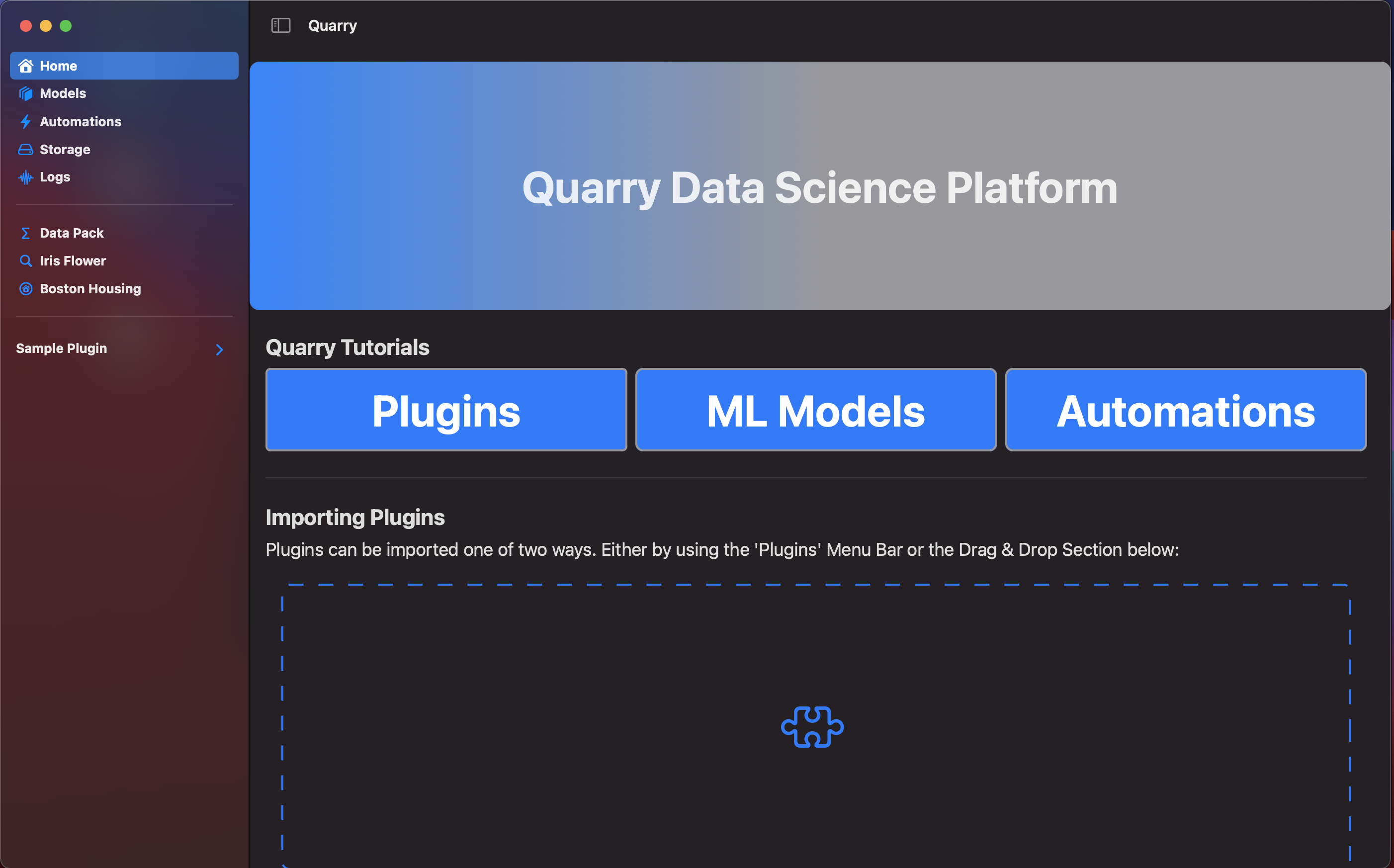 With a unified low code environment, users can utiilize the existing Quarry app framework to mine, explore, and analyze data. In addition, plugins allow users to expand the app's functionality to allow for custom data science projects.